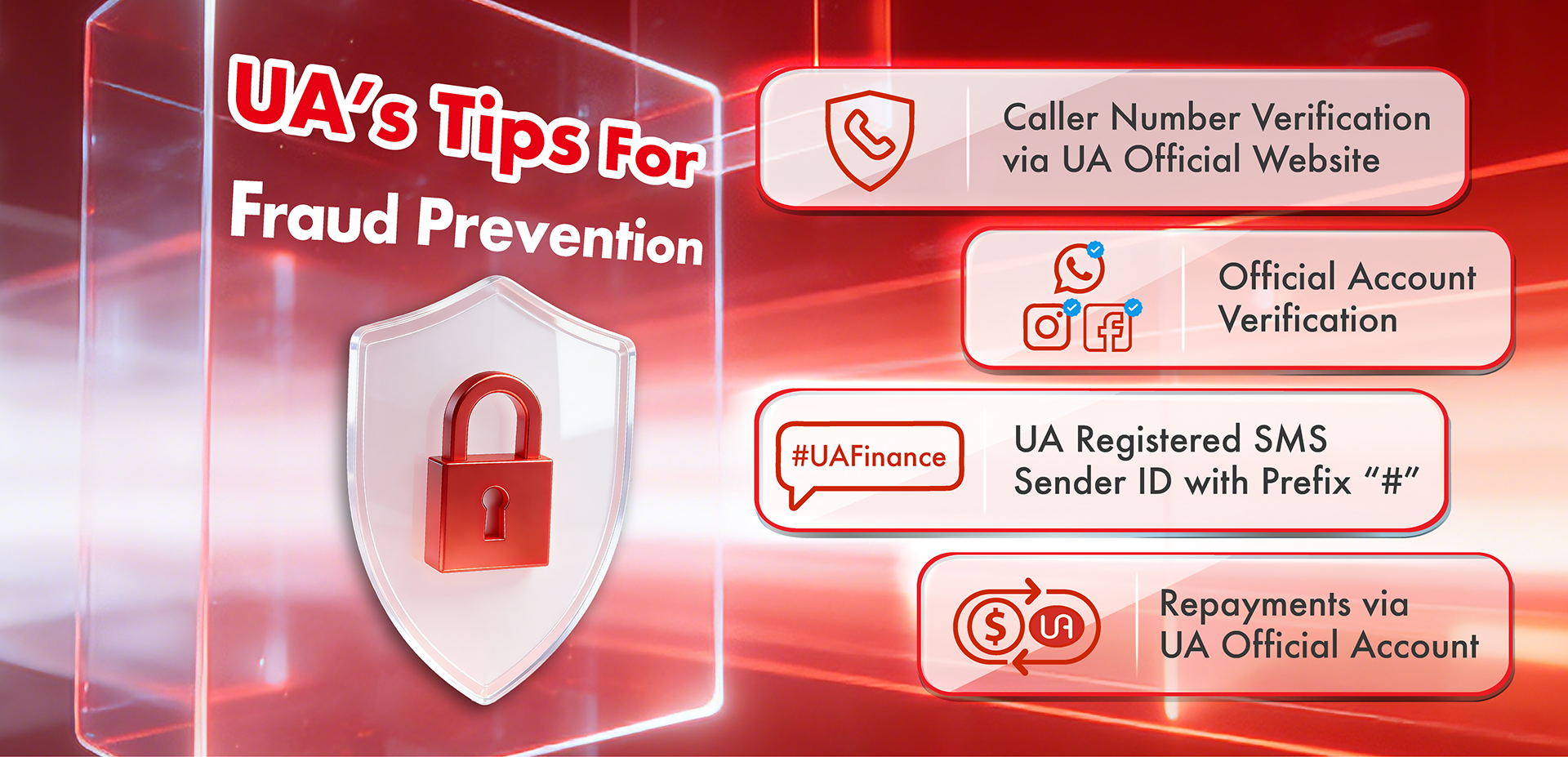 United Asia Finance Limited (the “Company”) has been receiving complaints from our customers and the public that they have received messages from different channels (including phone calls, SMS and instant messaging applications etc.) from persons impersonating to be our staff or our authorized personnel, promoting loan services or providing QR codes or FPS account numbers for payment collection and other incorrect information. If customers and/or the public do not accept their promoted products or services, they would respond with inappropriate language. The Company hereby makes an official statement as below: