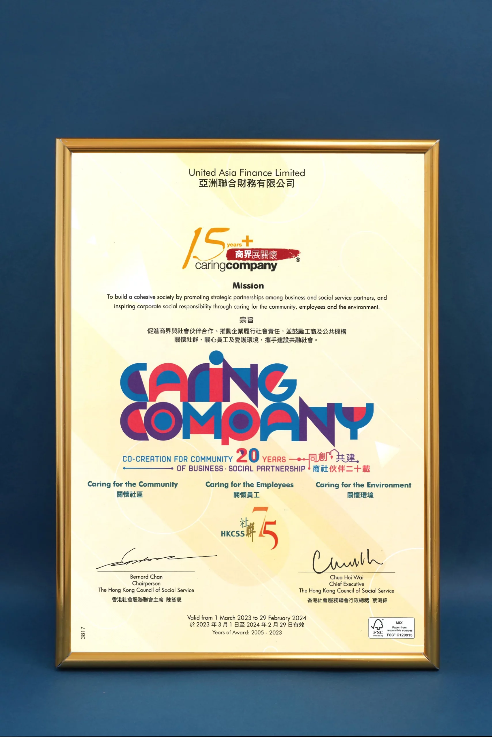 UA亚洲联合财务(UA)很高兴再度荣获由香港社会服务联会(社联)颁发「商界展关怀」标志。 UA连续16年获颁「15年以上商界展关怀」标志,肯定了集团不遗余力支持社区项目,履行社会企业责任,贯彻传扬关怀及服务社群的理念,为香港可持续发展作贡献。